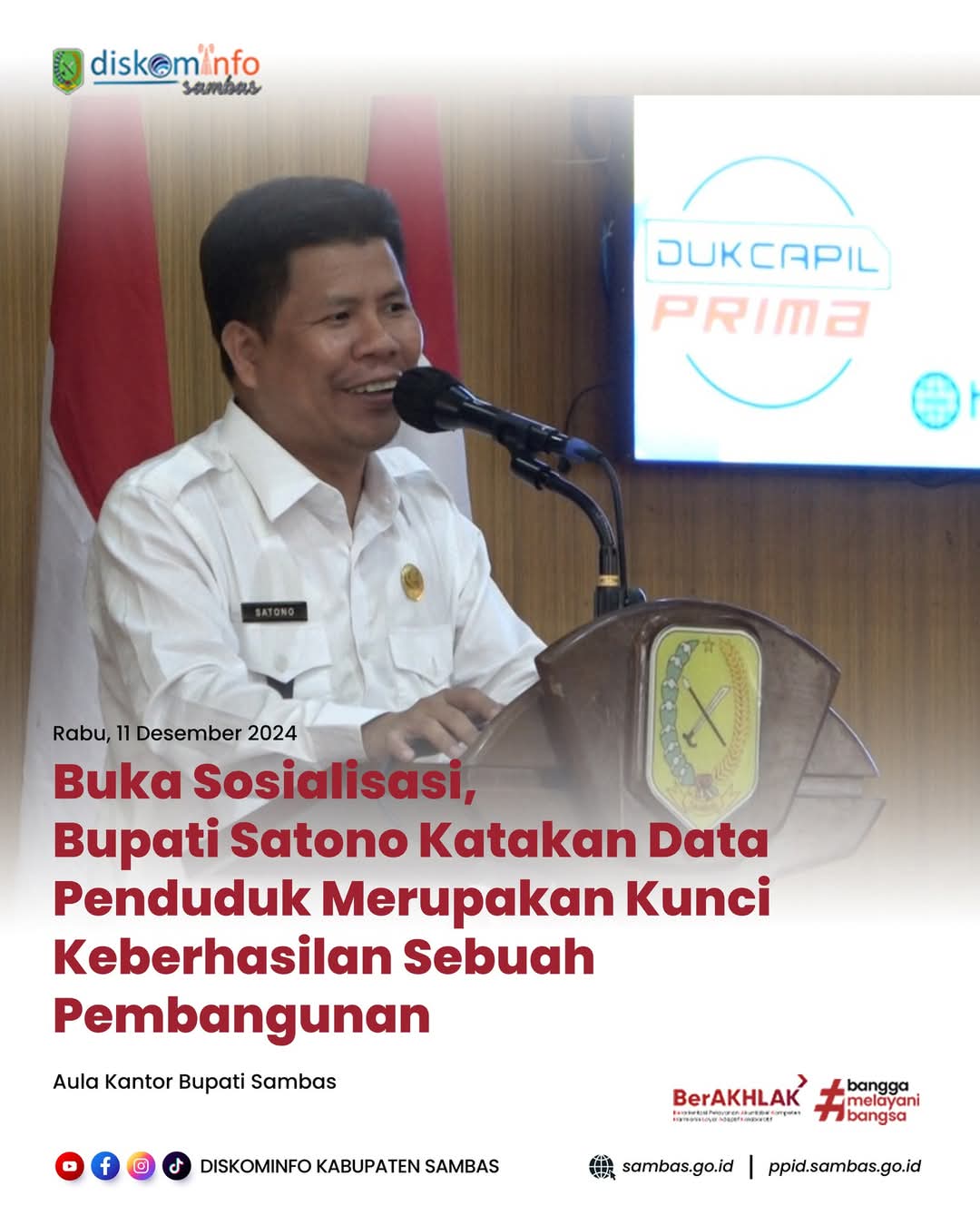 Sambas, PPID – Dinas Kependudukan dan Pencatatan Sipil (Disdukcapil) Kabupaten Sambas menggelar sosialisasi pendaftaran penduduk bertema “Akurasi Data Kependudukan untuk Perencanaan Pembangunan” pada Rabu, 11 Desember 2024. Kegiatan ini berlangsung di Aula Kantor Bupati Sambas dan dihadiri oleh Bupati Sambas, H. Satono, S.Sos.I, MH; Sekda Sambas, Ferry Madagaskar, M.Si; Ketua TP PKK Kabupaten Sambas; para Asisten Bupati; Kepala Organisasi Perangkat Daerah (OPD); serta seluruh camat dan kepala desa di lingkungan Pemda Sambas.