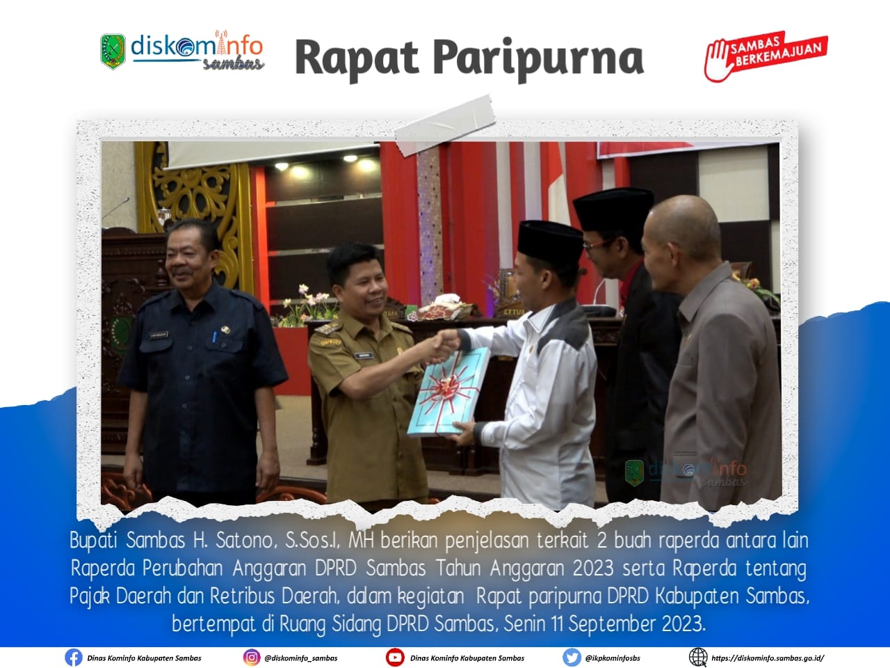 Sambas, PPID – Bupati Sambas, H. Satono, S.Sos.I, MH berikan penjelasan terkait 2 buah raperda antara lain Raperda Perubahan Anggaran Kabupaten Sambas Tahun Anggaran 2023 serta Raperda tentang Pajak Daerah dan Retribusi Daerah, dalam Rapat paripurna DPRD Kabupaten Sambas, bertempat di Ruang Sidang DPRD Sambas, Senin 11 September 2023.