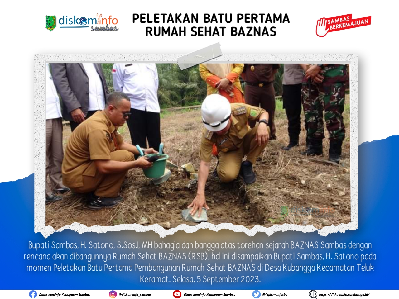 Sambas, PPID – Bupati Sambas, H. Satono, S.Sos.I, MH bahagia dan bangga atas torehan sejarah BAZNAS Sambas dengan rencana akan dibangunnya Rumah Sehat BAZNAS (RSB) , hal ini disampaikan Bupati Sambas, H. Satono pada momen peletakan batu pertama Pembangunan Rumah Sehat BAZNAS di Desa Kubangga Kecamatan Teluk Keramat, Selasa 05 September 2023.