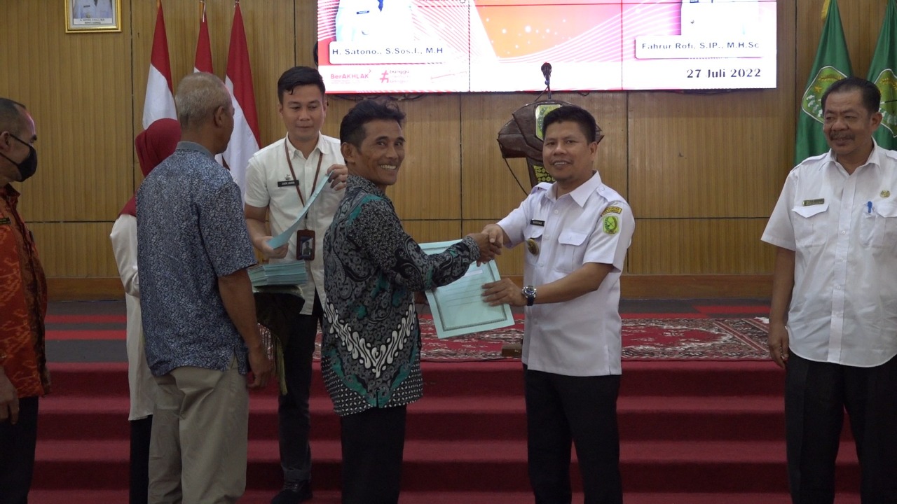 Sambas, PPID – Bupati Sambas H. Satono, S.Sos,I M.H serahkan Surat Keputusan Pemberhentian Pegawai Negeri Sipil dengan hak pensiun terharap 191 PNS di Pemerintah Kabupaten Sambas, Rabu, 27 Juli 2022.