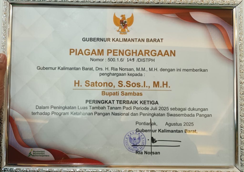 Piagam penghargaan diserahkan langsung oleh Gubernur Kalimantan Barat, dan menjadi bukti nyata komitmen Pemerintah Kabupaten Sambas dalam memperkuat sektor pertanian, khususnya di bidang produksi padi sebagai komoditas unggulan daerah.