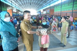 Sambas, PPID – Pemerintah Kabupaten Sambas melalui Dinas Koperasi UKM Perindustrian dan Perdagangan (Diskumindag) Kabupaten Sambas menggelar pasar murah yang bertempat di Area Pasar Tradisional Kartiasa, Desa Kartiasa Kecamatan Sambas Senin 18 April 2022
