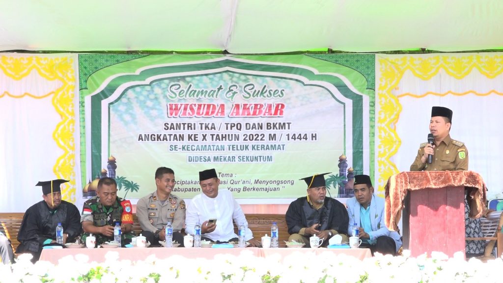 Sambas, PPID – Bupati Sambas, Satono menghadiri Wisuda Akbar Santri TK, TPQ, dan BKMT Angkatan X se-Kecamatan Teluk Keramat, di Desa Mekar Sekuntum, Kabupaten Sambas, Selasa (20/12/2022). Kegiatan yang digelar di SMPN 5 Teluk keramat juga dihadiri oleh Kemenag Kabupaten Sambas, unsur Forkopimda, Forkopimcam, para tokoh agama, tokoh masyarakat dan tamu undangan lainnya. Bupati Sambas satono mengucapkan terima kasih kepada penyelenggara yang telah mensukseskan acara, ia mengatakan bahwa wisuda tersebut merupakan implementasi dari slogan sambas berkemajuan.