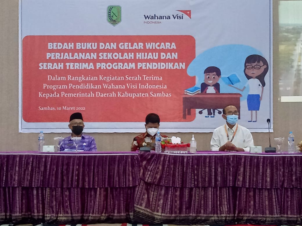 Sambas, PPID – Pemerintah Kabupaten Sambas dalam hal ini Dinas pendidikan dan kebudayaan menggelar acara bedah buku dan gelar wicara perjalanan sekolah hijau serta serah terima program pendidikan wahana visi Indonesia kepada Pemda kabupaten sambas yang dilaksanakan di gedung keberbakatan Dinas pendidikan kab. Sambas pada kamis, 10 Marer 2022. Kegiatan yang di buka oleh kepala Dinas pendidikan dan kebudayaan Kabupaten Sambas dihadiri langsung oleh bupati Sambas, manager wahana visi Indonesia serta pengawas, kepala sekolah dan guru.