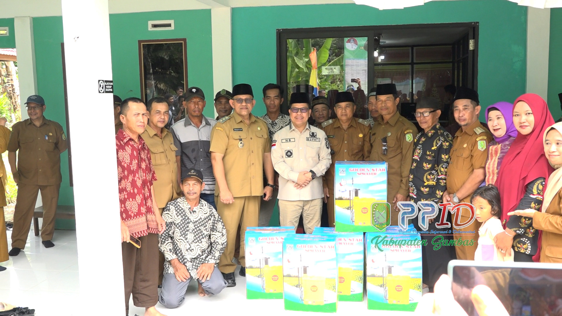 Sambas, PPID – Di tengah padatnya rangkaian kunjungan kerja meresmikan infrastruktur di Kecamatan Tekarang, Bupati Sambas, H. Satono, S.Sos.I, MH, menunjukkan kepeduliannya terhadap sektor agraris. Bertempat di Kantor Desa Sempadian, Selasa (13/1/2026), Bupati didampingi Wakil Bupati H. Heroaldi Djuhardi Alwi, ST, MT, menyerahkan bantuan alat pertanian berupa handsprayer (alat semprot elektrik) kepada sejumlah kelompok tani setempat.