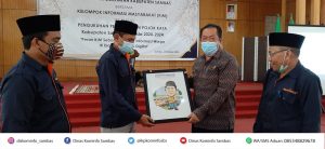 Diakhir acara pengurus KIM Pojok Kata memberikan cendaramata berupa karikatur kepada Sekda kabupaten Sambas dan Kepala Dinas Kominfo Kab. Sambas. (PPID Kab. Sambas/PIKP)