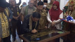 Sambas, PPID – Proyek Pembangunan Gedung fasilitas layanan perpustakaan umum Kabupaten Sambas yang telah rampung pada akhir tahun 2021 lalu akhirnya diresmikan hari ini selasa 28 Juni 2022 oleh Kepala Perpustakaan Nasional Muhammad Syarif Bando bersama Bupati Sambas H. Satono, S.Sos.I,MH. Hadir juga menyaksikan peresmian Gedung layanan perpustakaan Kab . Sambas Asisten Perekonomian dan Pembangunan Drs. Ignatius IK, SH,M.Si, Anggota DPR RI Komisi X Adrianus Asia Sidot,Bunda Literasi Kabupaten Sambas Yunisa Satono, Kepala Arsipda Kab Sambas Heryanto, S.Sos. peresmian gedung perpustakaan megah pertama di kabupaten Sambas ini ditandai dengan pemotongan pita dan pemukulan gong serta penandatanganan prasasti merupakan kegiatan rangkaian peningkatan indeks literasi Masyarakat (PILM) di Kabupaten Sambas.