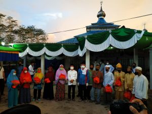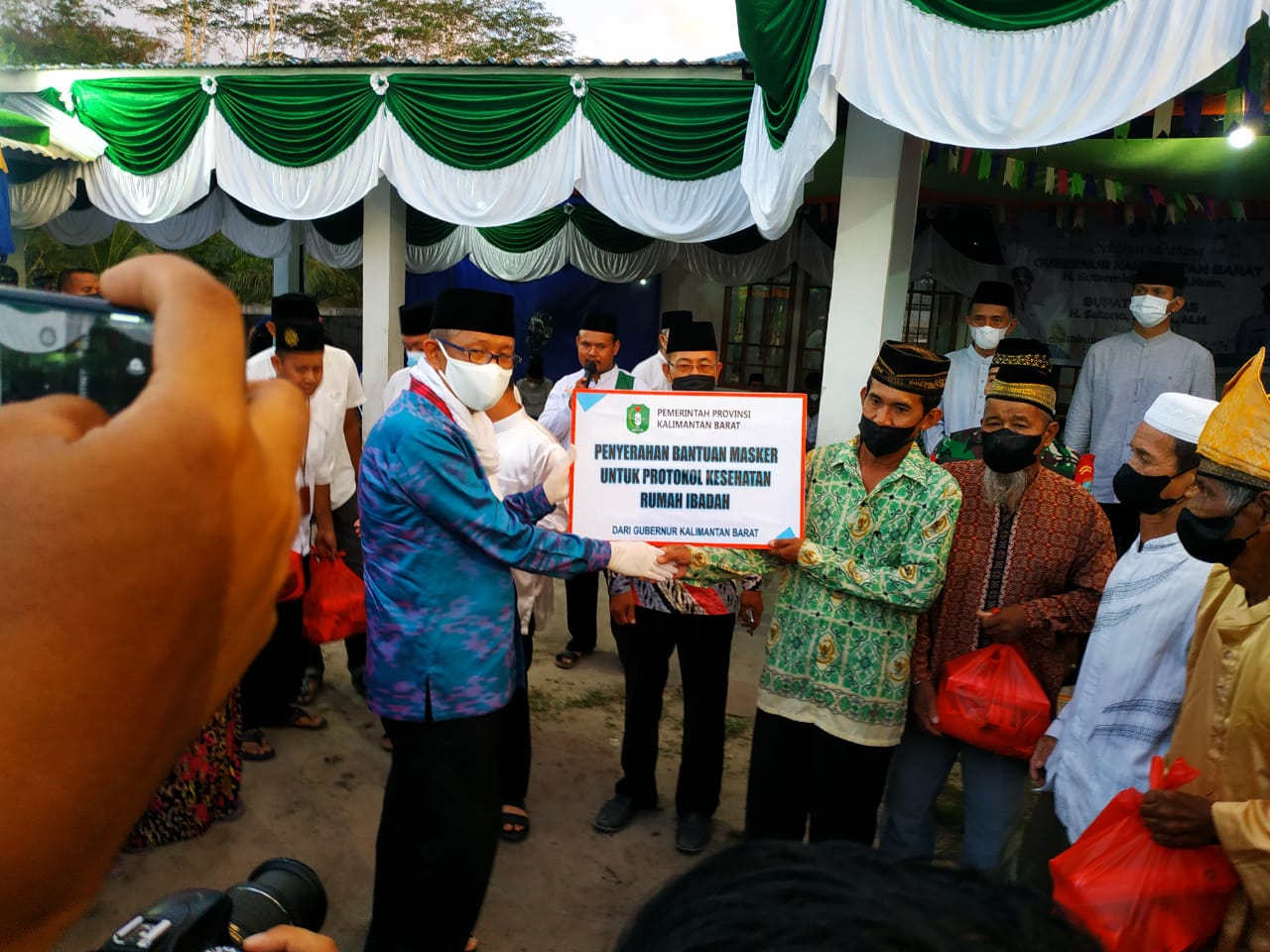 Usai memberikan sambutan, Gubernur Kalimantan Barat di temani Bupati Sambas menyerahkan bantuan sebanyak 300 paket bahan pokok dan 2.000 helai masker untuk protokol kesehatan rumah ibadah kepada warga Dusun Kota Lama, Desa Ratu Sepudak, Kecamatan Galing, Kabupaten Sambas.