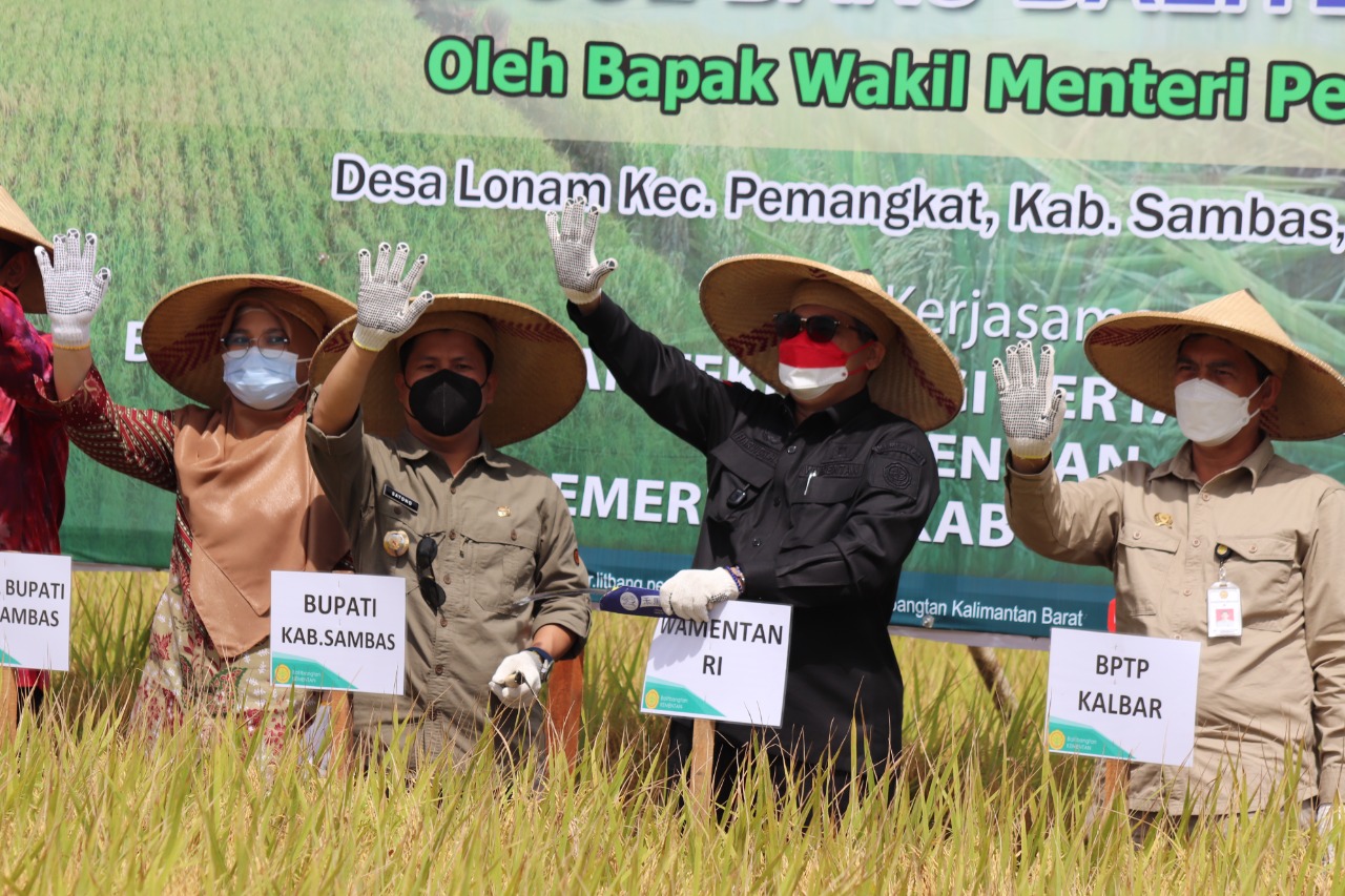 Sambas, PPID – Wakil Menteri Pertanian Harvick Hasnul Qalbi mendukung dan siap memfasilitasi niatan Pemerintah Kabupaten Sambas yang ingin menjadikan daerah tersebut sebagai lumbung beras di Kalimantan barat. Komitmen itu ditegaskan Harvick sesusai melakukan Panen Padi di Desa Lonam Kecamatan Pemangkat, Sambas, Kalbar Kamis 19 Agustus 2021. Hadir dalam kesempatan itu Perwakilan Gubernur Kalbar, Bupati Sambas, Wakil Bupati Sambas, petani, dan Kelompok Tani Muda Sambas, yang baru dikukuhkan oleh Wamentan.